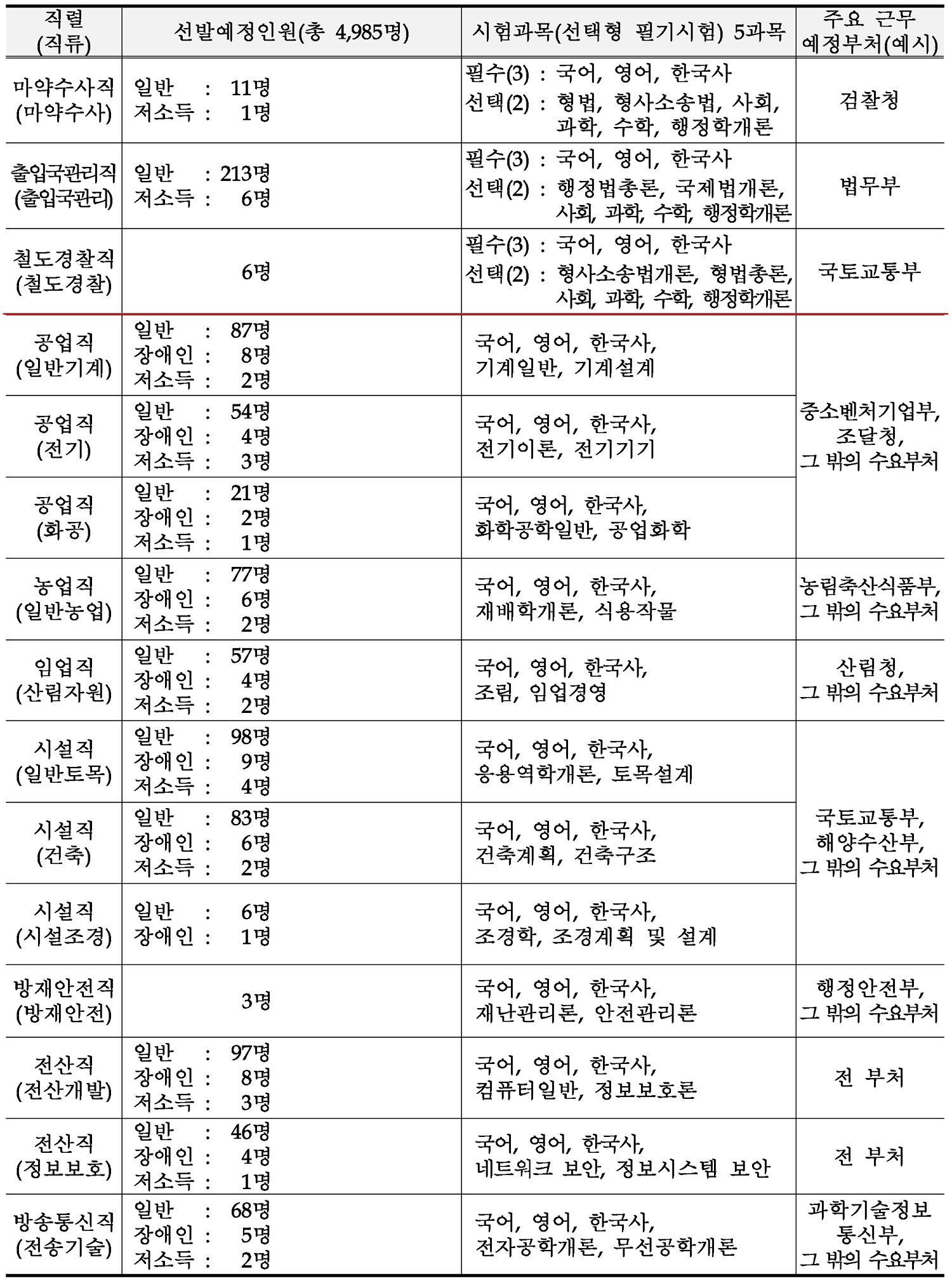 행정직렬은 필수시험과목 3과목, 선택과목 2과목인 반면
