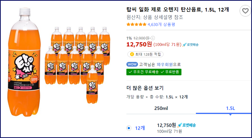 와우 회원의 경우 1.5L, 12개 가격이 12,750원,