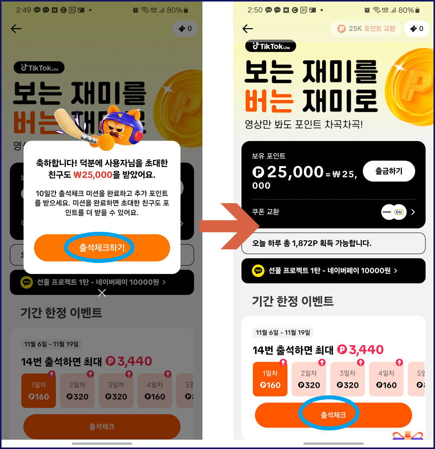 앞서 말했듯이 초대한 친구가 10일동안 출석체크를 해야