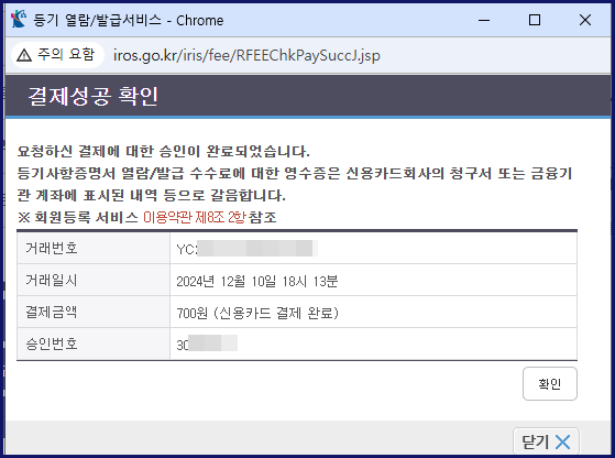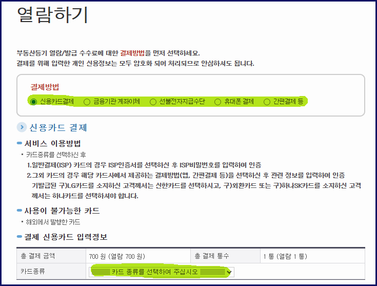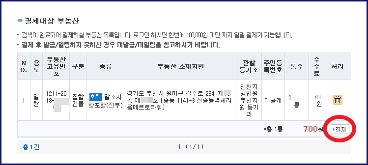 등기부등본 열람 비용은 700원, 출력은 1000원입니다.