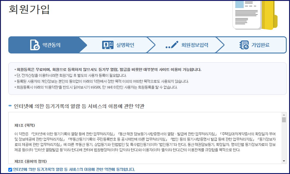 회원가입 또는 로그인 전 인터넷등기소 홈페이지에 접속하면