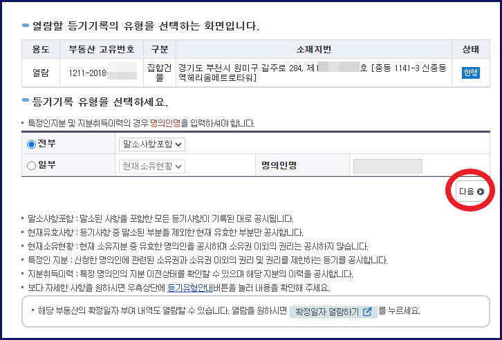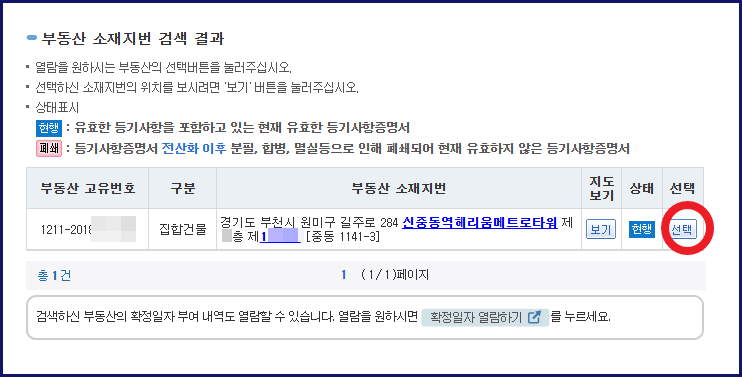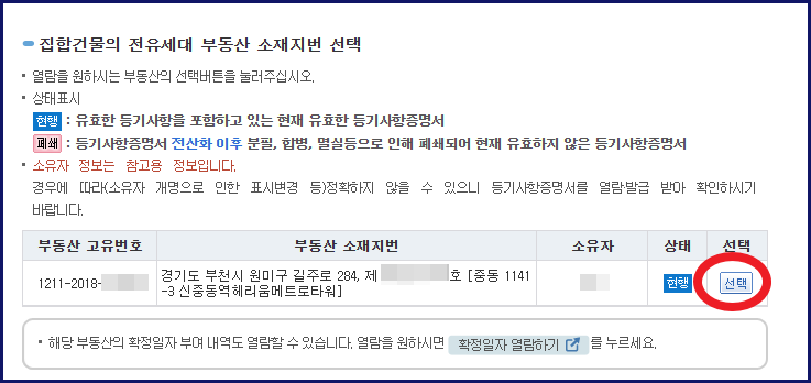 부동산의 소재지번 확인후 또 선택을 해줍니다.