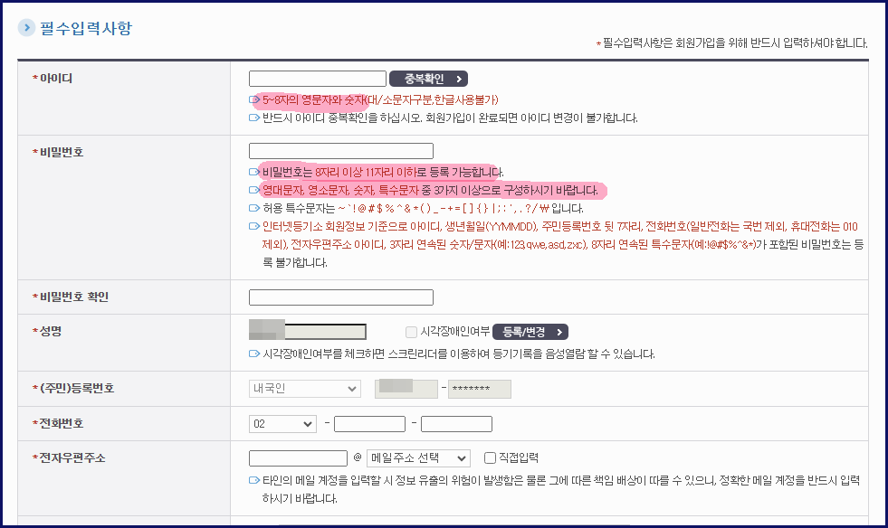 실명인증이 끝나면 아이디와 비번을 입력해줍니다.