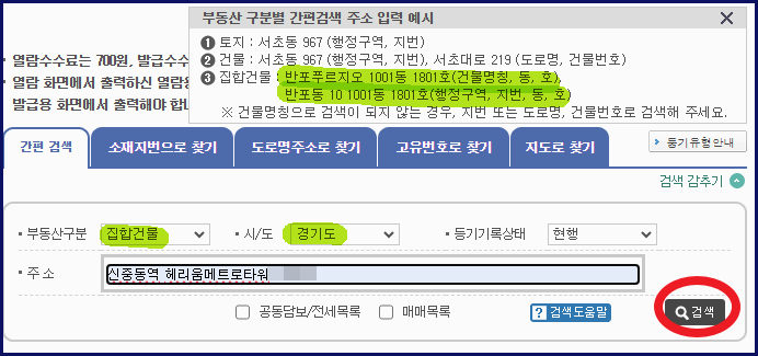 토지, 건물, 집합건물 의 주소 입력 예시를 참고해서 넣어주면 됩니다.