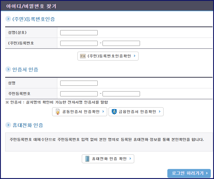 아이디 / 비밀번호 찾기는 주민번호나, 인증서, 휴대전화등으로