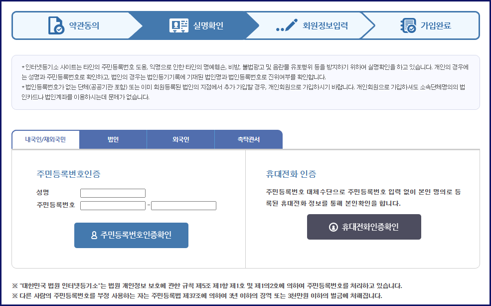 회원가입 절차는 약관동의, 실명확인, 회원정보 입력 순으로 진행됩니다.